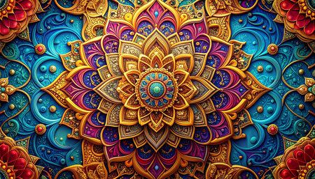 A richly detailed and layered mandala pattern with intricate floral motifs in vibrant red, blue, green, and gold, showcasing symmetrical complexity.