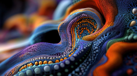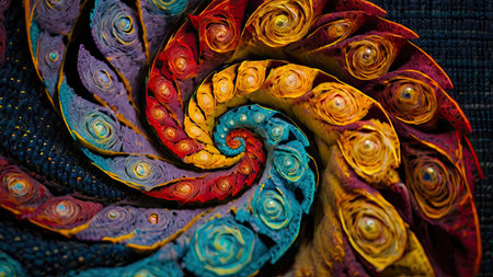 Vibrant spirals display Fibonacci patterns intricately woven into a mesmerizing fabric, illustrating nature's mathematical elegance and artistic vitality.