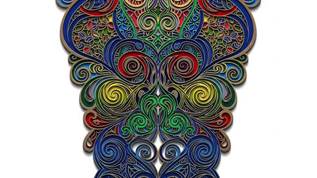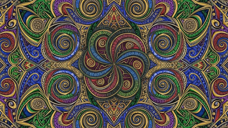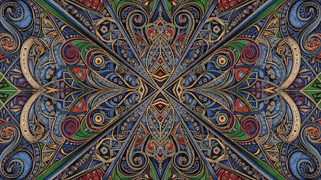 A highly symmetrical and intricate kaleidoscopic pattern featuring detailed ornate designs, swirling motifs, and a rich palette of colors including gold, blue, green, and red.