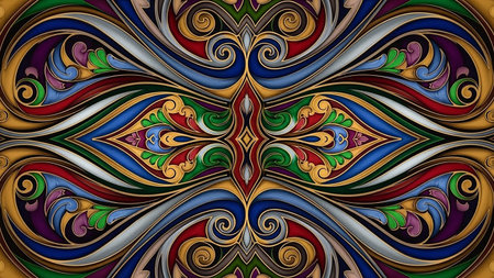 A richly colored and intricate kaleidoscope pattern featuring symmetrical floral motifs in green, blue, red, and gold hues.