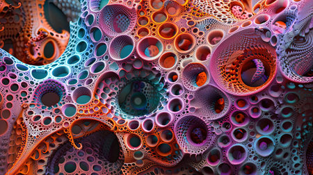 Vibrant close-up of an abstract organic structure with interconnected holes and circular patterns, creating a mesmerizing geometric texture.