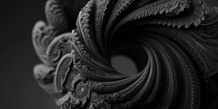 An abstract image showcases a swirling design with detailed textures and intricate patterns. The artwork features shades of gray and black, with emphasis on depth and form. The composition suggests a dynamic movement against a dark backdrop, suitable for various design applications and creative projects.