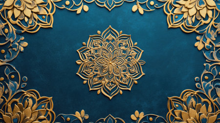 Detailed golden mandala artwork on rich blue backdrop, highlighting floral motifs and intricate designs, representing beauty and creativity in decorative craftsmanship