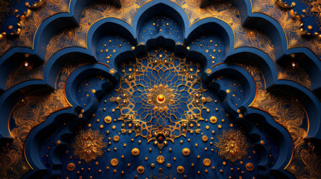 Detailed mandala design in gold and navy blue, featuring floral and geometric patterns, highlighting artistic craftsmanship and elegance in decorative art