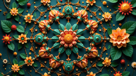 Colorful floral pattern with intricate designs on teal background. That the image is generated using AI.