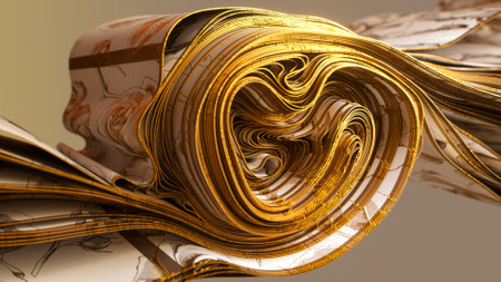 Elegant 3D swirls in golden hues with intricate line details. 3D illustration combining luxury and art.