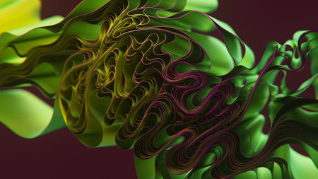 Bright green and purple wavy lines create a lively and dynamic abstract design reminiscent of branching plants or shimmering kaleidoscopic graphics. 3d illustration