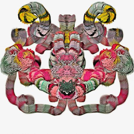 A detailed fractal design featuring intertwined patterns in orange, blue, and gray with a symmetrical, kaleidoscopic composition.