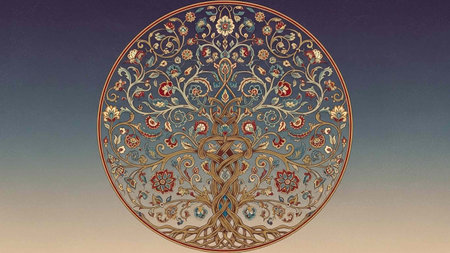 Close-up of a detailed Islamic tile pattern featuring gold, blue, and brown colors.