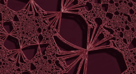 A visually striking abstract image featuring intricate red patterns on a dark background
