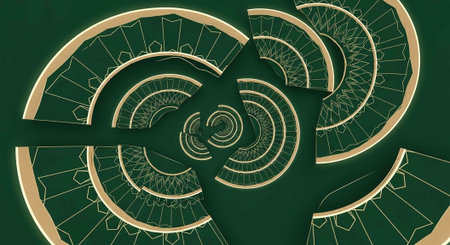 A stunning green and gold abstract design with intricate circular patterns and shapes