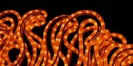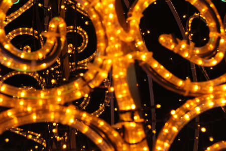 Decorative decoration made of orange electric lamps for a festive show. Blurred glowing lights