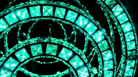 many mystery circles one bigger than another with crystal clean blue stones with shine and light inside big luxury modern lamp. bright crystal diamond blue chandelier with luxury design