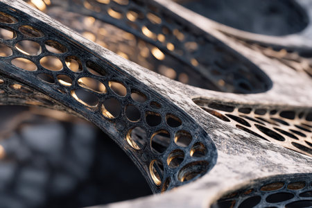 Abstract close-up of a textured structure with an intricate pattern of interconnected oval holes, showcasing a blend of metallic and earthy tones with a soft focus in certain areas