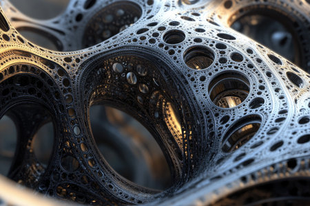 A 3D abstract structure, with complex shapes and textures creating depth and intrigue