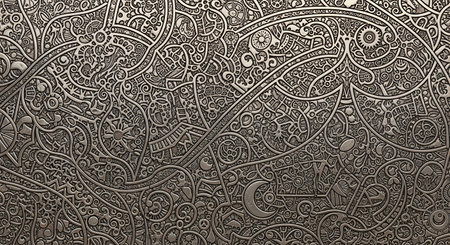 An extremely detailed and intricate seamless pattern embossed on a metallic surface. The complex, organic, and geometric designs create a sophisticated and mesmerizing background, suitable for fantasy, steampunk, or luxury themes.