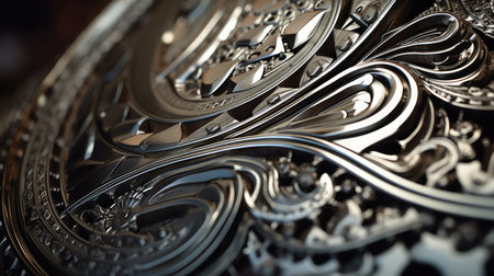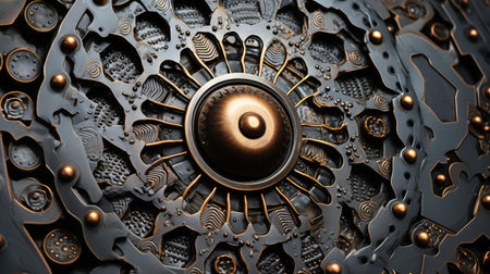 This image showcases a detailed metallic surface featuring intricate geometric patterns and textures, embodying a blend of industrial artistry and modern design.