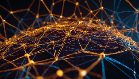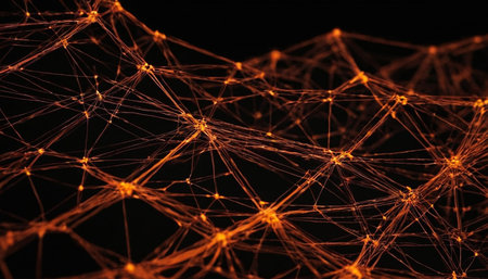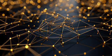 An abstract image showcases a network of interconnected nodes. The nodes have a warm, golden color, linked by lines that suggest connectivity. The composition is set against a dark background, and the lighting creates a sense of depth and dimension, suitable for technology or business applications.