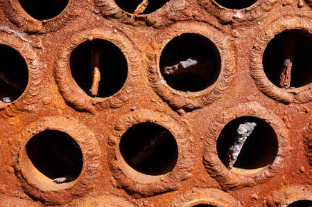Close-up view of rusty metal pieces showcasing intricate textures, corroded surfaces, and various holes. Ideal for projects needing industrial or abstract visuals.