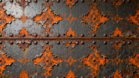 Intense corrosion texture on a dark industrial steel panel revealing vibrant orange iron oxide beneath peeling paint, joined by a horizontal row of protruding metal rivets.