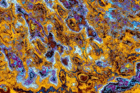 A high-resolution image showing the colorful, abstract patterns of corrosion on metal with textured detail.