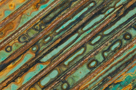 An old metal surface with a mix of corrosion and weathered patterns, showing the effects of time.