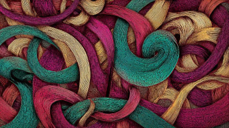 Abstract illustration showcases vibrant swirling strands in red, teal, and gold, creating a rich texture and dynamic visual experience with intricate patterns and depth, AI generated