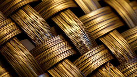 This close-up image captures the intricate details of a metallic woven texture, showcasing the interplay of light and shadow. Ideal for design projects.