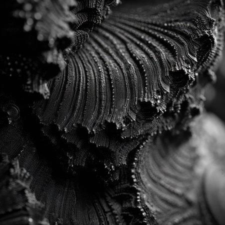 This abstract image showcases a complex fractal form with layered textures and patterns. The monochrome palette accentuates the intricate details and the play of light and shadow. The image's close-up perspective and depth of field provide a captivating visual experience, suitable for various design projects and artistic applications.