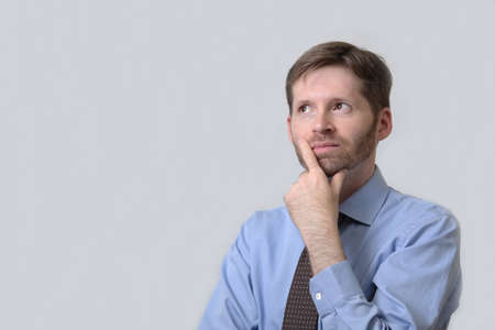 Portrait of thoughtful young man who looks away and touching his chin and weighs the pluses and minuses of the offer isolated on white background with copy space.