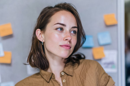 A young woman with brown hair sits in a workspace. She looks away, deep in thought as colorful notes cover the wall behind her. Bright light fills the room during the day.