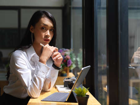 Portrait of female freelancer looking into camera while working with tablet in cafeteria
