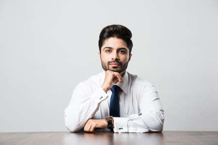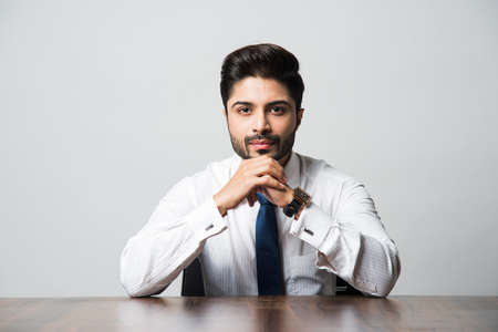Portrait of Indian Male businessman sitting at table / desk in office, over grey background