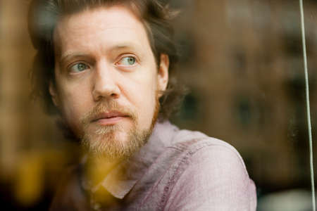 Sad middle-aged man thinking and looking through the window