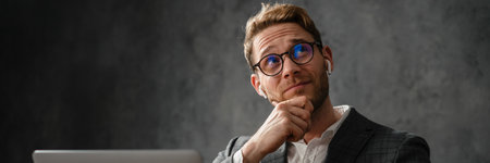 The pensive man in headphones and glasses wrinkling his forehead while sitting at the table in the studio