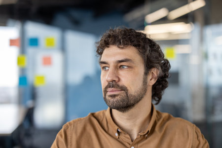 The mans face in close-up looks thoughtfully away