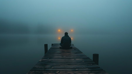 A person sits alone on a wooden dock, silhouetted against a misty lake, lost in thought.
