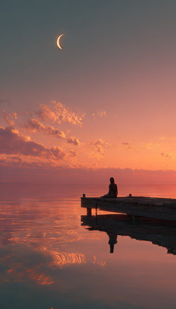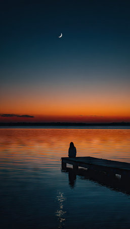 A person is silhouetted on a wooden pier, gazing at a vibrant sunset reflected in calm water. The composition highlights gradients of orange, blue, and navy in the sky, contrasted by a crescent moon. Suitable for use in visual content related to contemplation, tranquility, and natural beauty for editorial and commercial projects.