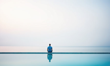 A lone individual meditates in a serene aquatic setting, reflection creating a peaceful symmetry