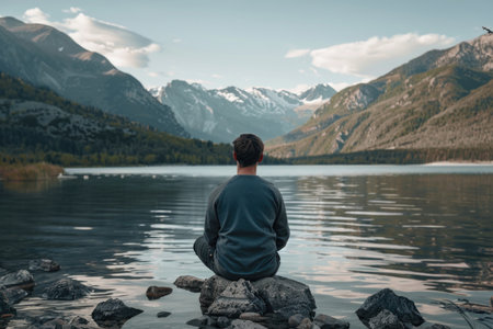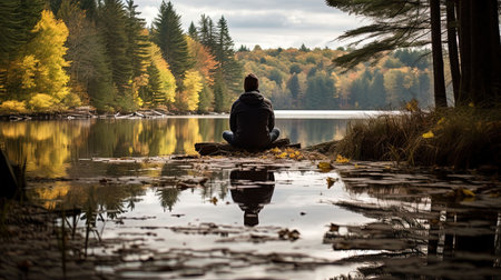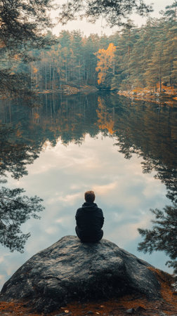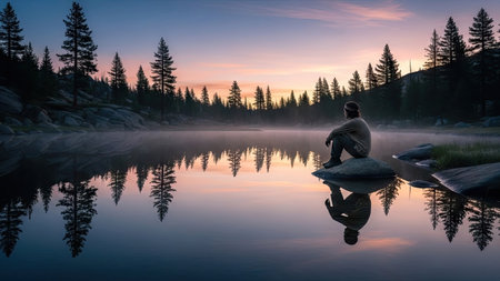 A man sits on a rock by a lake, looking out at the water. The scene is peaceful and serene, with the man's reflection in the water adding to the sense of calm. Concept of solitude and contemplation