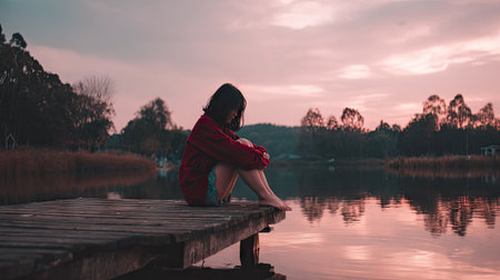 Young woman sitting on a wooden pier by a lake in the evening