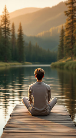 A person sits cross-legged on a large rock, contemplating by a tranquil lake. The sun sets, casting warm hues on the water and trees, creating a calming atmosphere.