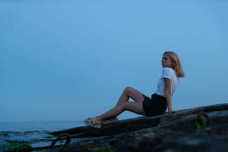 A 20 year old girl in ordinary clothes sits and dreams on a concrete pier on the seashore after sunset