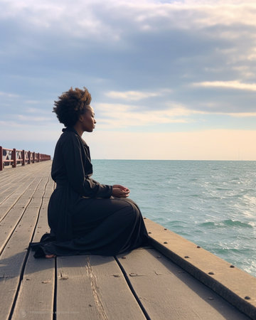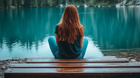 Tranquil Sunset Meditation Woman Embracing Inner Peace and Reflection by the Serene Lakeshore