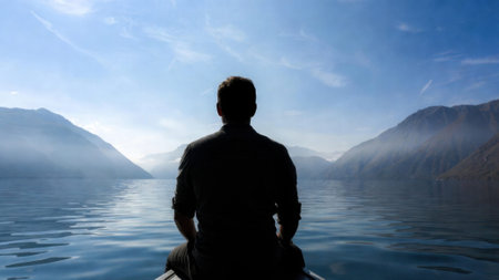 Young caucasian male sitting alone on boat in peaceful mountain lake scene.