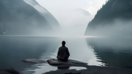 Serene sunrise over the lake as a person meditates peacefully on a rock