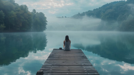 A woman sits on a dock by a lake, looking out at the water. The scene is peaceful and serene, with the misty atmosphere adding to the sense of calm. The woman is lost in thought