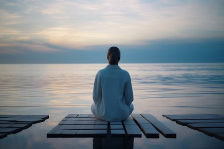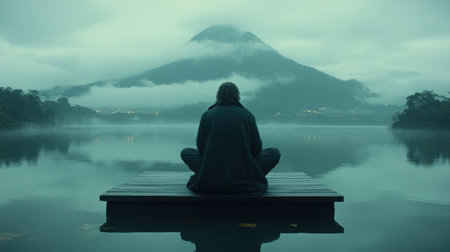 A Solitary Figure Meditating by Calm Waters, Reflecting the Peaceful Evening Sky and Mountains