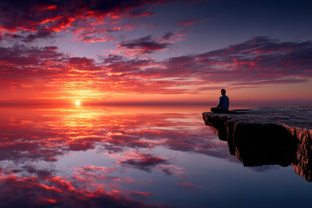 Silhouette of a man sitting on a cliff, soaking in the vibrant colors of a sunset while gazing at the tranquil ocean horizon