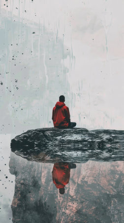 A man in a red jacket sits on a rock overlooking a body of water. The image has a serene and contemplative mood, as the man is lost in thought